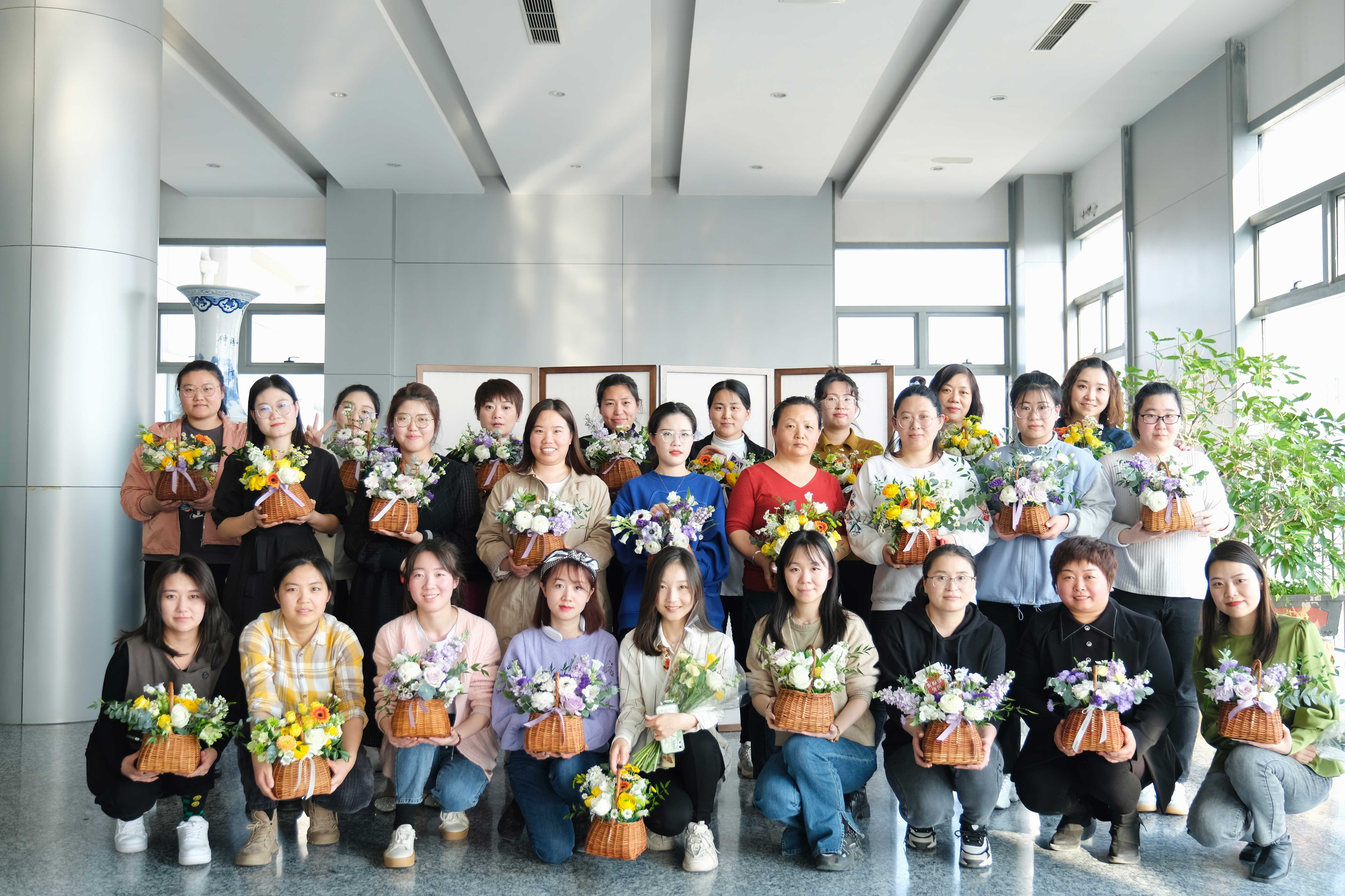 操,向大家詳細講解如何制作一籃層次分明,錯落有致的花束。女職工們?nèi)硇耐度氲交顒又校J真聆聽